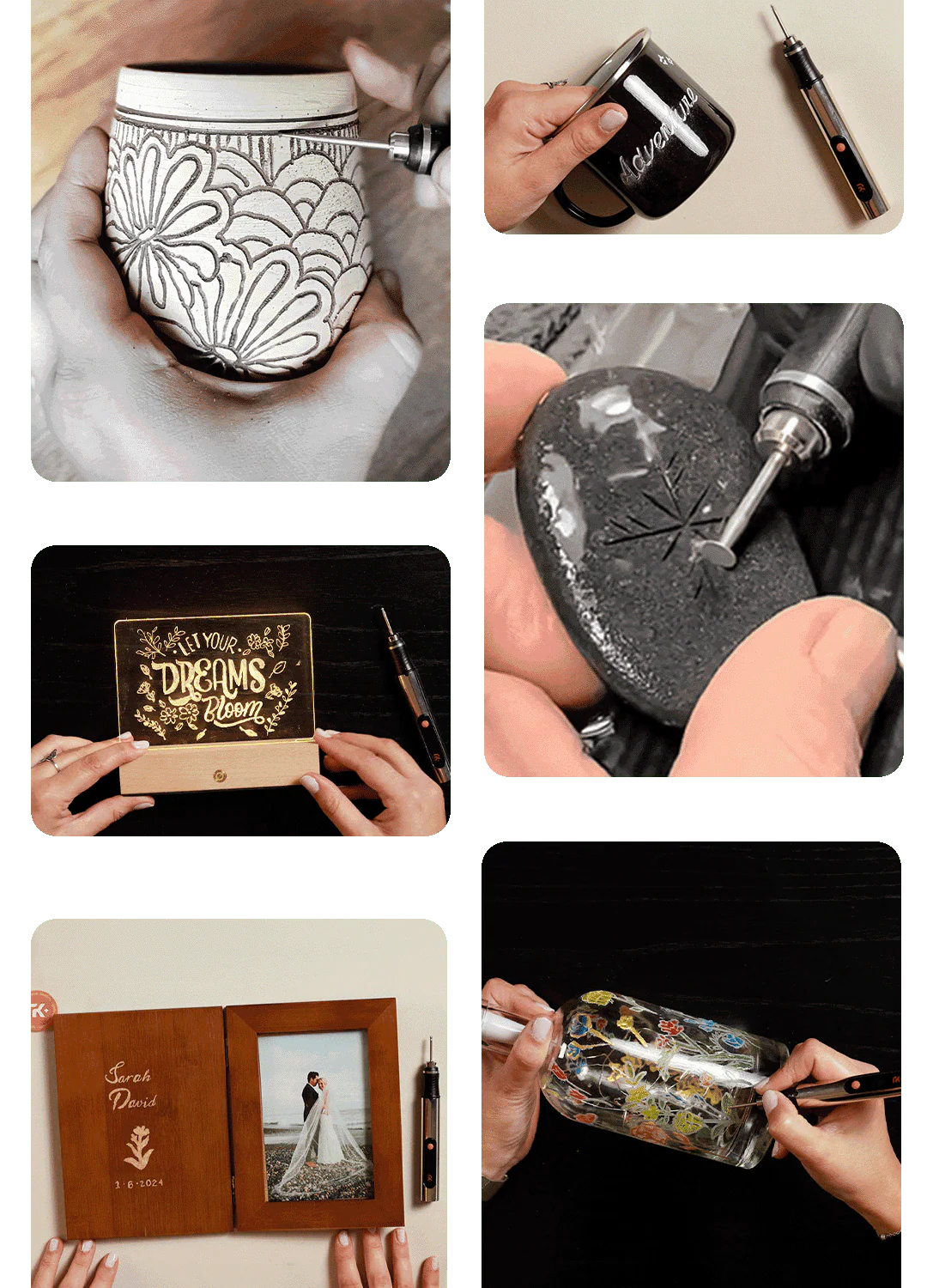 Rilassati e lascia fluire la tua creatività. Con soli tre semplici passaggi, puoi provare la soddisfazione di realizzare qualcosa di unicamente tuo. La Penna Incisoria Zengraver rende facile creare pezzi che non solo amerai, ma che impressioneranno anche chiunque li veda.